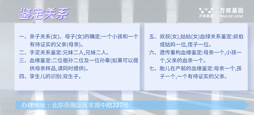 親子鑒定是一種通過比較親緣關系DNA序列的分子遺傳學技術對親子關系進行鑒定的方法,而北京門頭溝是我國較為發達的城市之一,擁有先進的科技和醫療技術。在這里進行親子鑒定是很方便的,同時也有多種不同的親子鑒定類型可供選擇,下面北京門頭溝萬核基因就詳細介紹一下。北京門頭溝的親子鑒定類型及價格。