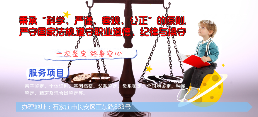 辦理地址:石家莊市長安區(qū)正東路833號,服務(wù)范圍:長安區(qū)、橋西區(qū)、新華區(qū)、井陘礦區(qū)、裕華區(qū)、藁城區(qū)、鹿泉區(qū)、欒城區(qū)、井陘縣、正定縣、行唐縣、靈壽縣、高邑縣、深澤縣、贊皇縣、無極縣、平山縣、元氏縣、趙縣、辛集市、晉州市、新樂市等周邊城市,擁有雄厚的基因檢測實(shí)力,嚴(yán)格遵守我國相關(guān)的親子鑒定法規(guī),所有檢測結(jié)果均在資質(zhì)認(rèn)證實(shí)驗(yàn)室中完成。其所采用的實(shí)驗(yàn)方法具有極高的準(zhǔn)確性和可靠性,使用的設(shè)備也都采用先進(jìn)的技術(shù)和高品質(zhì)的儀器,從而保證檢測結(jié)果的信譽(yù)和公正性。