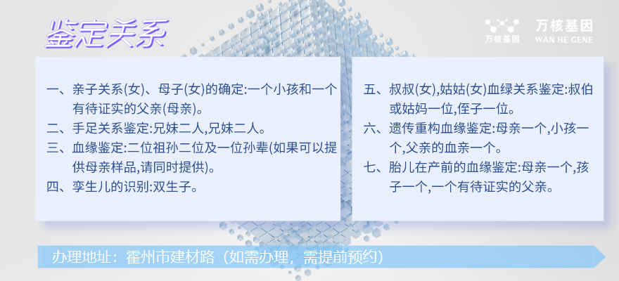如果你有任何關于費用和鑒定流程的疑問,可咨詢霍州萬核親子鑒定咨詢中心,我們全程為您提供高質量、可靠的產前無創鑒定服務。