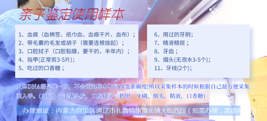 個(gè)人DNA親子鑒定辦理地址:內(nèi)蒙古自治區(qū)通遼市扎魯特旗魯北鎮(zhèn)大街西段(如需辦理,需提前預(yù)約),扎魯特服務(wù)地區(qū)包括:科爾沁區(qū)、科爾沁左翼中旗、科爾沁左翼后旗、開(kāi)魯縣、庫(kù)倫旗、奈曼旗、扎魯特旗、霍林郭勒市等周邊城市扎魯特,可在線咨詢:無(wú)創(chuàng)產(chǎn)前親子鑒定、司法親子鑒定、移民親子鑒定、入戶親子鑒定、中考親子鑒定、高考親子鑒定、個(gè)人DNA親子鑒定等等咨詢服務(wù)。