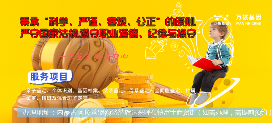 同時(shí),也提供了兩種取樣方式供您選擇,即自行取樣送到額濟(jì)萬核親子鑒定服務(wù)機(jī)構(gòu)或到鑒定中心由工作人員為您取樣,額濟(jì)辦理地址:內(nèi)蒙古阿拉善盟額濟(jì)納旗達(dá)來呼布鎮(zhèn)富士商貿(mào)街(如需辦理,需提前預(yù)約)。再次強(qiáng)調(diào),鑒定結(jié)果僅可作為上訴的依據(jù),但絕不能做為法庭呈堂證供。