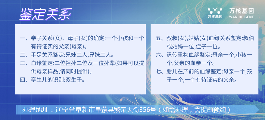 阜新蒙古族親子鑒定中心鑒定地址,親子鑒定作為一項關系到個人和家庭利益的服務,在科學面前真相只有一個,阜新蒙古族萬核親子鑒定咨詢中心抱著這樣的信念,懷著對DNA科技的景仰和虔誠的這一個的目標,我們走出了一條嚴謹而深遠的道路.....,我們采用嚴格技術標準為社會各界提供親子鑒定和個人身份識別的服務,出具的鑒定報告具備法律效力,全國通用。阜新蒙古族親子鑒定辦理地址:遼寧省阜新市阜蒙縣繁榮大街356號(如需辦理,需提前預約)。