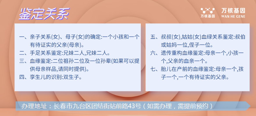 九臺區萬核親子鑒定服務機構是一家專門做親子鑒定的機構。你想查一下自己的親子關系嗎?九臺區萬核基因可以進行多種鑒定服務,包括長春九臺個人隱私親子鑒定。
