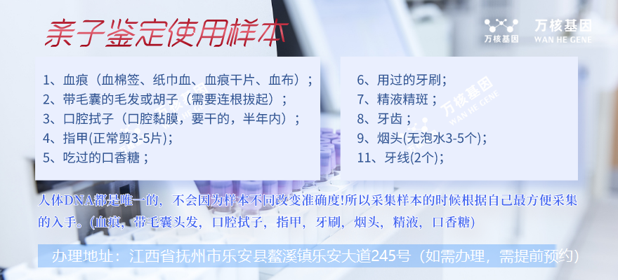 如果你需要在樂安辦理孕期無創親子鑒定,可在線咨詢樂安萬核親子鑒定服務機構。孕期親子鑒定只需采集準媽媽10ml外周血,疑似父親可以采集血液樣本,或者是血痕、精液、精斑、帶毛囊的頭發、指甲、唾液、口香糖、口腔拭子、礦泉水瓶、牙線、煙頭等(任選其一即可)等生物材料,測試它們之間的DNA信息是否匹配。這種測試可以確定一個孩子是否為某個人的親生子女,或者確定兩個人是否具有親緣關系。