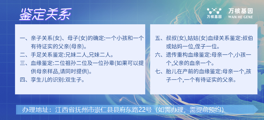 崇仁孕期胎兒親子鑒定辦理地址:江西省撫州市崇仁縣縣府東路22號(如需辦理,需提前預約),萬核親子鑒定專業服務機構是一家提供親子鑒定服務的機構,其核心業務是對父母和孩子之間的親子關系進行鑒定。崇仁萬核基因擁有專業的技術團隊和精密的鑒定設備,可以通過DNA檢測的方法,準確地確認親子關系。該機構服務范圍覆蓋全國各地,為客戶提供安全、快捷、準確、保密的產前親子鑒定服務。同時,機構還提供多種親子鑒定產品和解決方案,滿足不同客戶的需求和要求。