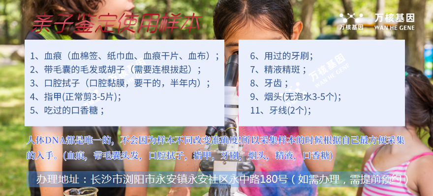 長沙縣個人隱私親子鑒定鑒定的樣本,可以是:血痕、口腔拭子、毛發、...[詳細]