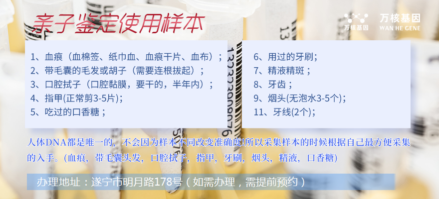 總而言之,選擇適合自己的樣本開(kāi)展親子鑒定是很重要的。只有在采集環(huán)節(jié)中細(xì)心、認(rèn)真細(xì)致地實(shí)際操作,才能確保鑒定報(bào)告的準(zhǔn)確性。因而,一定要跟蓬溪萬(wàn)核親子鑒定服務(wù)中心相關(guān)工作人員掌握采集步驟及注意事項(xiàng),以免引起二次補(bǔ)樣子的狀況發(fā)生。