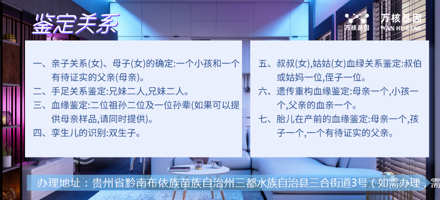 可在線咨詢:無創產前親子鑒定、司法親子鑒定、移民親子鑒定、入戶親子鑒定、中考報告親子鑒定、高考親子鑒定、三都隱私個人DNA親子鑒定等等咨詢服務,萬核親子鑒定咨詢服務機構,聯合了多家權威法醫物證司法鑒定及基因檢測公司的親子鑒定服務咨詢機構,采用先進的DNA檢測技術,確保鑒定結果的準確性和可靠性。