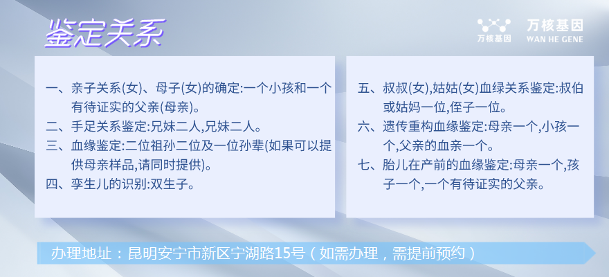 通常,當您想要進行個人dna親子鑒定時,與安寧萬核基因聯系:電話:4001789498,討論樣本采集方式,測試步驟和費用等相關問題,辦理地址:昆明安寧市新區寧湖路15號(如需辦理,需提前預約)。