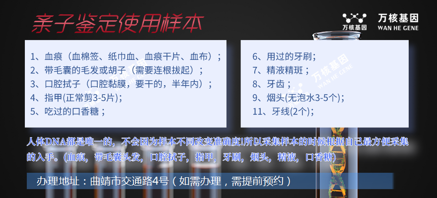 宣威親子鑒定的樣本采集是非常關鍵的一步,務必慎重考慮。并且,在采集樣本時,您需要了解可以采集哪些樣本: