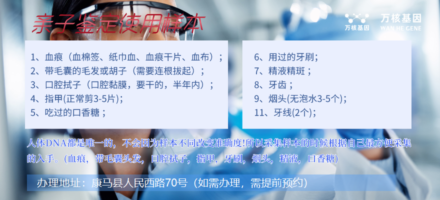 如果你需要在康馬辦理孕期無創親子鑒定,可在線咨詢康馬萬核親子鑒定服務機構。孕期親子鑒定只需采集準媽媽10ml外周血,疑似父親可以采集血液樣本,或者是血痕、精液、精斑、帶毛囊的頭發、指甲、唾液、口香糖、口腔拭子、礦泉水瓶、牙線、煙頭等(任選其一即可)等生物材料,測試它們之間的DNA信息是否匹配。這種測試可以確定一個孩子是否為某個人的親生子女,或者確定兩個人是否具有親緣關系。