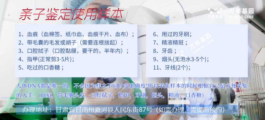 如果你需要在夏河辦理孕期無創親子鑒定,可在線咨詢夏河萬核親子鑒定服務機構。孕期親子鑒定只需采集準媽媽10ml外周血,疑似父親可以采集血液樣本,或者是血痕、精液、精斑、帶毛囊的頭發、指甲、唾液、口香糖、口腔拭子、礦泉水瓶、牙線、煙頭等(任選其一即可)等生物材料,測試它們之間的DNA信息是否匹配。這種測試可以確定一個孩子是否為某個人的親生子女,或者確定兩個人是否具有親緣關系。